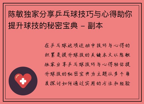 陈敏独家分享乒乓球技巧与心得助你提升球技的秘密宝典 - 副本